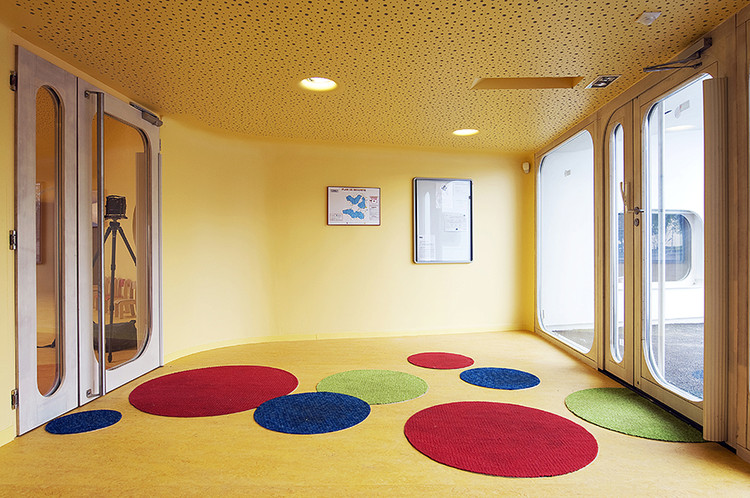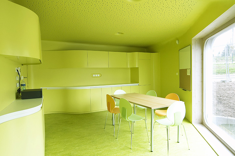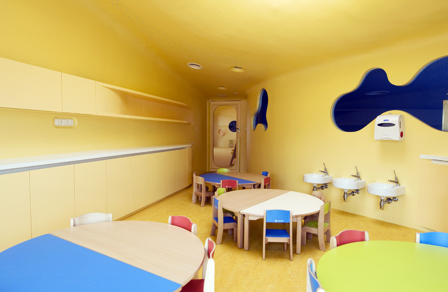 這樣子設(shè)計(jì)的另一個(gè)結(jié)果是,因?yàn)樗覀儾辉傩枰谶@兩個(gè)建筑物建造走廊。每一個(gè)孩子的空間都可以連接到建筑的中心區(qū)域。除了它的審美效果和人體工程學(xué)的利益,真正的收獲的是節(jié)省了空間。由于這個(gè)系統(tǒng),我們已經(jīng)能夠節(jié)省約100萬平方米的空間,其中給出了11%的比例是走廊所占用的。這樣做的好處使我們能夠設(shè)計(jì)出兩棟尊重BBC(低能源使用建筑物)條例的建筑物,同時(shí)沒有超越我們客戶的臨時(shí)預(yù)算。