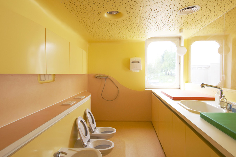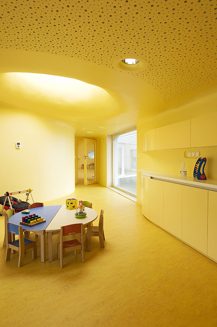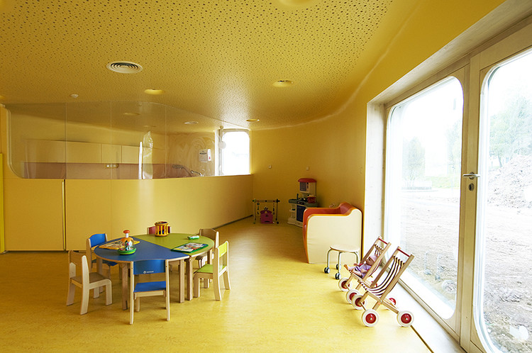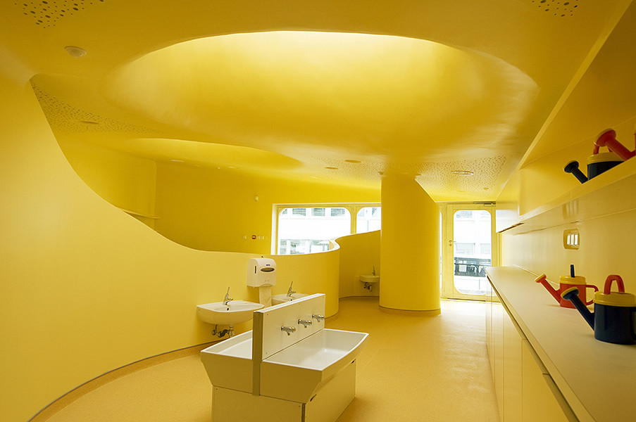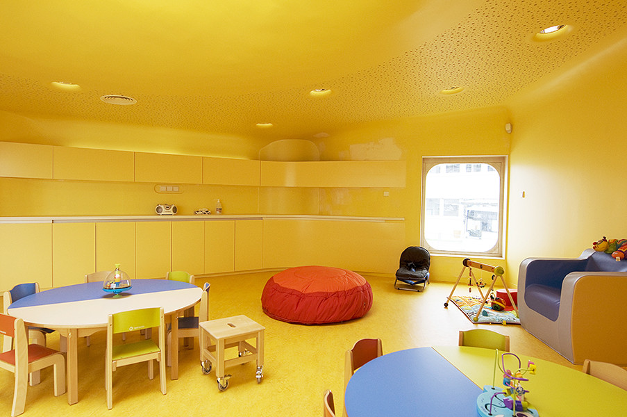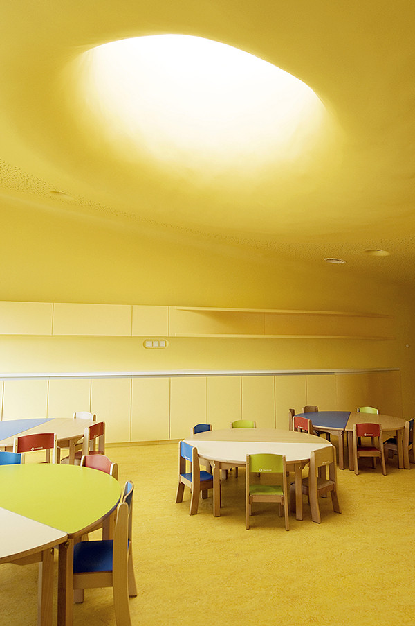 此外雨水管位于建筑側(cè)面,這樣家長們永遠(yuǎn)不用抱起孩子跨過水溝。內(nèi)部空間的組織都圍繞著高度安全的圓形中央空間,孩子們的空間圍繞并匯聚于此。每個(gè)相鄰的空間都彼此連通便于相互照料,最大程度的保證了安全。中心帷幕似的木結(jié)構(gòu)最高處是3米寬的聚碳酸酯拱形天花板,保證室內(nèi)全天都沐浴在充足的陽光之下。幼兒園設(shè)計(jì)