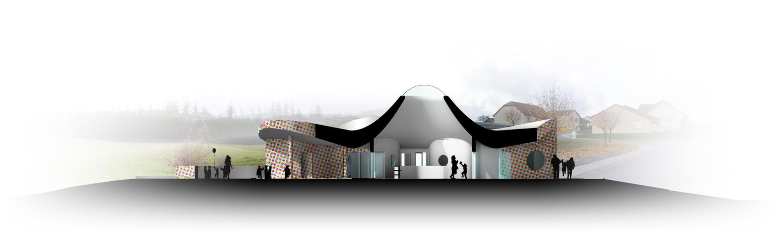 關(guān)于保育設(shè)施的設(shè)計(jì),它是朝南的方位,這給了我們與環(huán)境的無縫集成的設(shè)想創(chuàng)造了一個(gè)平臺,我們的想法是讓這個(gè)結(jié)構(gòu)自然傾斜。每個(gè)平臺對應(yīng)像花園,游樂場,教育花園等功能...設(shè)施的造型體現(xiàn)了建筑的風(fēng)格,這簡直就像是是其它教育機(jī)構(gòu)所包圍的局面。我們的建筑物具有既不是“主立面”,也不是“背立面”的特點(diǎn),但作為一個(gè)整體,只有一個(gè)邊緣,它只有一個(gè)美學(xué)上均勻的外觀,其可以從周圍可見。