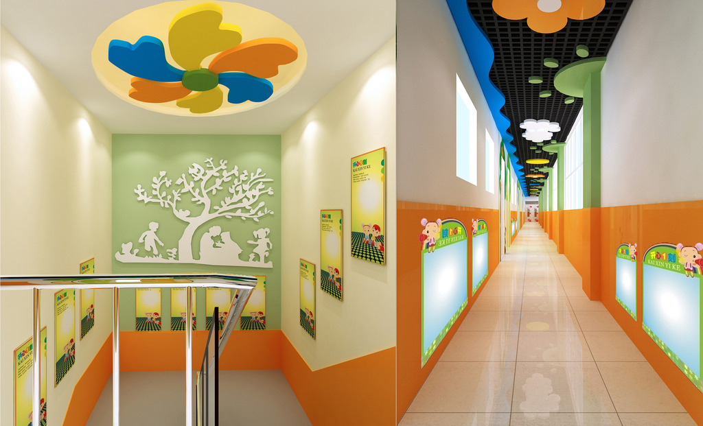 幼兒園裝修走廊要貫通一氣,盡量保證走廊的寬度在1.2米以上。邊上的圍欄最好是密封型的,高度不能低于1米。樓梯護(hù)欄在體現(xiàn)建筑特點(diǎn)上有一定的作用,因而在造型上要獨(dú)特,有幼兒園特點(diǎn)??纱蚱苽鹘y(tǒng)的平直封閉形式,有凹凸變化,可按現(xiàn)代的平面來(lái)構(gòu)成,增加圍欄的趣味性,也可以設(shè)計(jì)成上部分通透、下部分封閉的形式,但要防止幼兒攀爬兩邊墻面。
