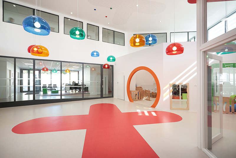 這兩個(gè)項(xiàng)目之間的關(guān)系是基于尊重和樂(lè)趣。彩色的筆觸到處都是,成為孩子們玩耍的形狀。幼兒中心的開(kāi)放式陽(yáng)臺(tái)和室外操場(chǎng)直接回答養(yǎng)老院的直線(xiàn)和優(yōu)雅的外觀。他們中的每一個(gè),避免任何分區(qū)。充滿(mǎn)樂(lè)趣。彩色畫(huà)隨處可見(jiàn),給孩子們會(huì)帶來(lái)了歡樂(lè)
