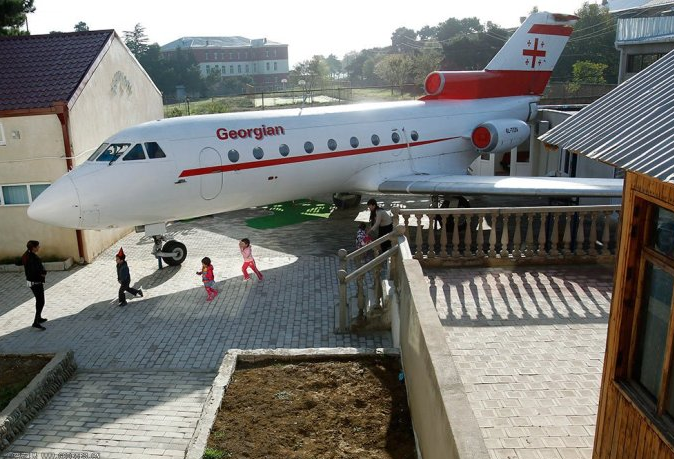 在格魯吉亞有一座幼兒園可以說是世界上獨(dú)一無二的一所幼兒園,因?yàn)檫@個(gè)幼兒園是格魯吉亞魯斯塔維市的加里?查皮茲在格魯吉亞航空購買的一架雅克-42型客機(jī)飛機(jī)去改造成的一所幼兒園。盡管這架飛機(jī)老舊了但飛機(jī)仍能工作,經(jīng)過改造在機(jī)艙內(nèi)安裝了游戲設(shè)計(jì)玩具和教育器材,把有1500個(gè)按鈕的駕駛艙儀器保留作為游戲的道具。