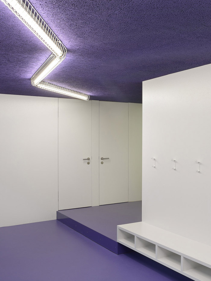 幼兒園的室內(nèi)也有著各個房間的用途,入口一進(jìn)去就是衣帽間,然后到教室-資料室-游戲區(qū)域和多功能房間。這些依次布局的房間升起于一小段臺階之上。沿著臺階可以一直到達(dá)頂層的辦公室。辦公室體量同時覆蓋了位于其下方的入口。繼續(xù)沿著臺階往下可以返回入口,這樣完成了整個循環(huán)路線。