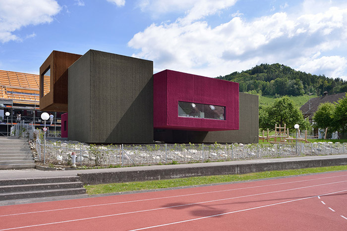 遙遠(yuǎn)的瑞士在鄉(xiāng)村一所小學(xué)的附近坐落著一座風(fēng)格獨特的幼兒園,遠(yuǎn)遠(yuǎn)看去就像是用幾個大箱子堆積起來的一樣,其表面種著有,草黃色、紅色和橄欖綠三種顏色的人工草坪形成了獨特的立面,使得幼兒園和鄉(xiāng)村中心的環(huán)境更加的和諧,相比冰冷的墻面柔軟的草坪墻壁更加適合兒童。
