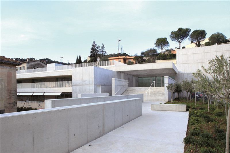 在法國(guó)的一家托兒中心名為L(zhǎng)a Trintite兒童日托中心,這間托兒中心的位置非常有趣,是在公墓和一座購物中心中間的一個(gè)花園深處,建筑在場(chǎng)地中的植入,連通周邊環(huán)境,為整個(gè)小鎮(zhèn)創(chuàng)造了一個(gè)新的物理連接——形成一個(gè)連接上部和下部道路的公共通道。受到經(jīng)濟(jì)要素的現(xiàn)實(shí),我們限制了挖掘量,因此將停車場(chǎng)放置在屋頂上,這樣地面空間也可以被塑造成為新的公共空間。兩層樓底板挑出了3米的寬度,以保護(hù)操場(chǎng)不受到太陽的直曬。這些水平層面要素的設(shè)計(jì)平衡了結(jié)構(gòu)性的垂直框架,并且容納了日托中心的所有功能要素需求。