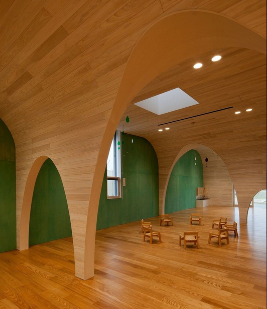 一所位于日本愛(ài)知縣張地區(qū)的旭城這是給五歲一下的一百多個(gè)孩子使用的幼兒園,在過(guò)去很多的幼兒園中孩子們的日?;顒?dòng)就像是吃飯玩耍和上廁所或者是睡覺(jué)都會(huì)是在分開(kāi)的各個(gè)室內(nèi)進(jìn)行的,然后設(shè)計(jì)師的目標(biāo)是想在一種連續(xù)時(shí)間狀態(tài)下去捕捉孩子的這些活動(dòng),并在這個(gè)時(shí)間容器中布局建筑以及藝術(shù)繪品,共同創(chuàng)造出好似一個(gè)立體圖畫(huà)書(shū)般的幼兒園。(幼兒園室內(nèi)設(shè)計(jì))