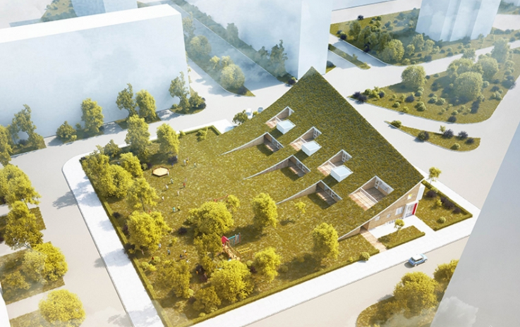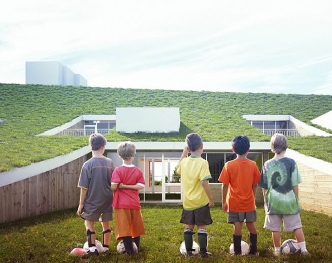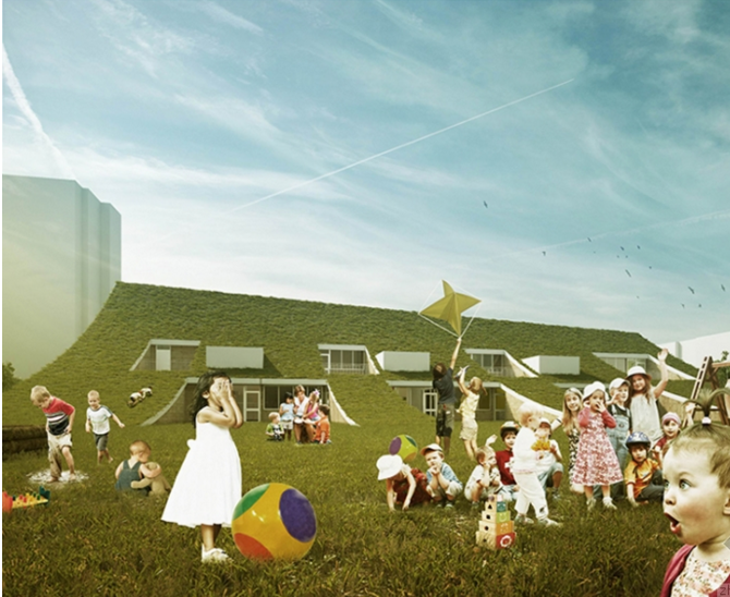 傾斜的屋頂結(jié)構(gòu)是這座建筑最大的特色,它使屋頂和地面的界限變得模糊。傾斜的屋頂煙臺可以為幼兒園的教室?guī)砀嗟年柟?。在街道的入口處,幼兒園的屋頂急劇抬高。在街道上望向幼兒園,像是個滑梯,很有特點。整個屋頂是綠色的,給孩子們創(chuàng)造了一個連續(xù)的活動空間。傾斜的屋頂煙臺也可以為幼兒園的教室?guī)砀嗟年柟?。這個設(shè)計打破了板整的規(guī)則,不去扼殺孩子們愛玩兒的天性,更是為孩子們的學(xué)習(xí)場所增添了許多的夢幻元素,符合兒童的心理。