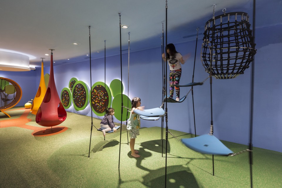 在進入影廳大門之后,孩子們將進入一個五彩斑斕的游戲樂園。設(shè)計師利用非線性的設(shè)計吸引人們的感官。這個樂園沒有規(guī)則的游玩路線,孩子們可以選擇滑行,攀登,爬行或跳躍于不同的游戲設(shè)施中。樂園中有兩個蠶繭形的小座椅,讓孩子們可以慵懶的躺在中間旋轉(zhuǎn)。