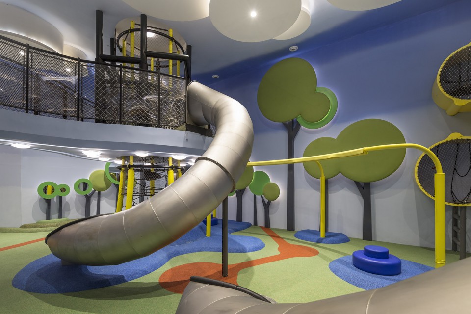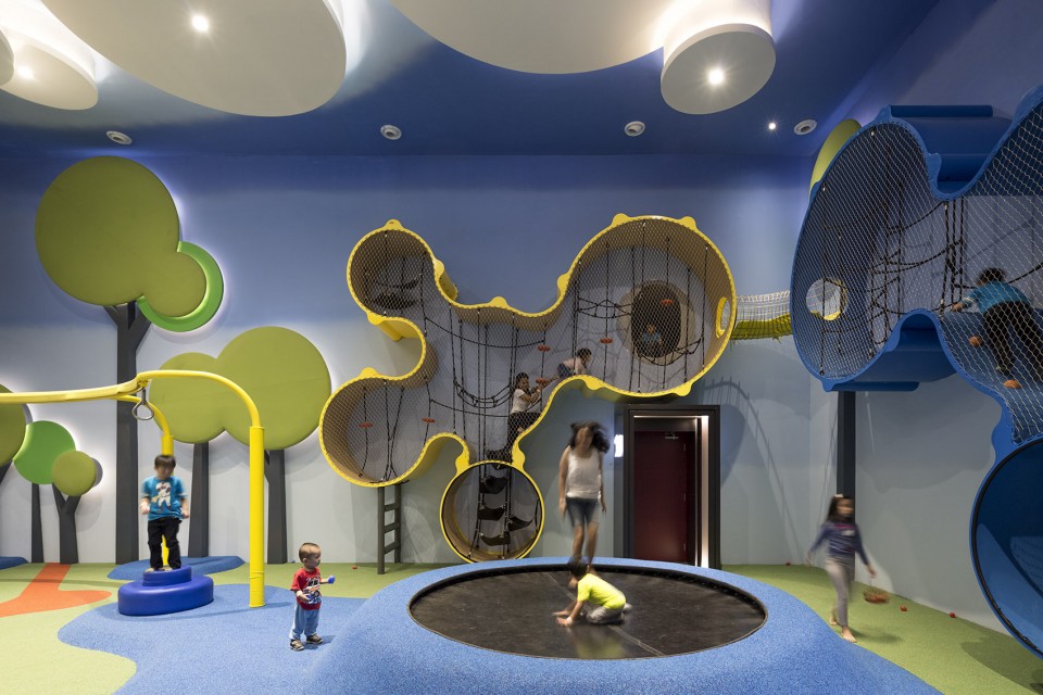 從游戲區(qū)到觀影區(qū)有許多有創(chuàng)意的出入口,需要孩子們?nèi)ヌ剿骱桶l(fā)現(xiàn)。其中一個最刺激好玩的入口是爬到黃色‘Wall- o-lla’樓梯的頂點,通過一個管道滑梯到達觀影區(qū)屏幕下方的彩色海洋球池中。Cinemaxx 不僅僅是一個游樂場和電影院,這兩者無縫巧妙的融合使一家人在這里愉悅的相處,并讓人在兒童的歡聲笑語中也能很好的觀賞電影。(幼兒園室內(nèi)設(shè)計)