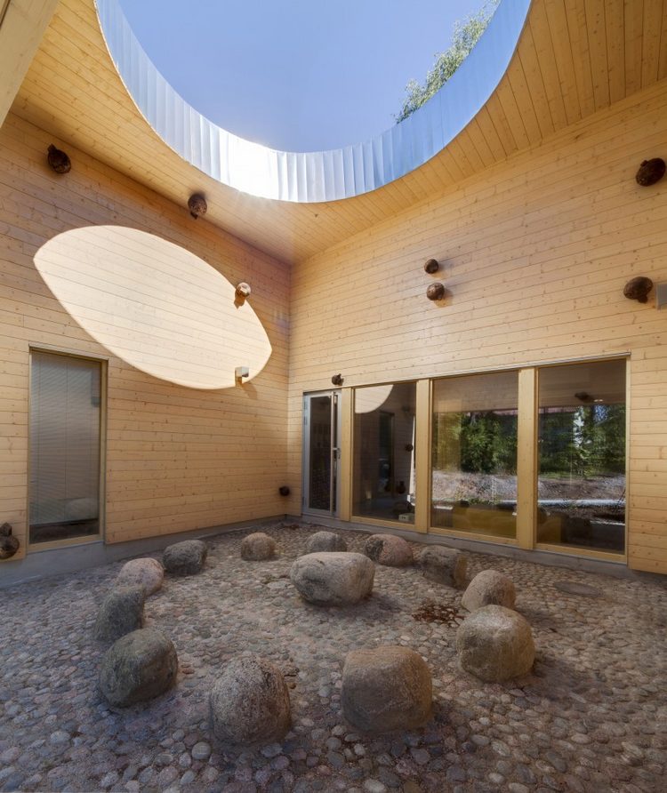 整個建筑鋪砌一新的內(nèi)部庭院朝向門廳開放,會內(nèi)的天花板上有一個巨大的露天圓形開口,隨著時間的推移使得移動的陽光成為了室內(nèi)庭院中一道亮麗的風(fēng)景,庭院內(nèi)還有這藝術(shù)家創(chuàng)作由20個落葉松木制作的球體組成,代表著宇宙的雕像。(幼兒園室內(nèi)設(shè)計)