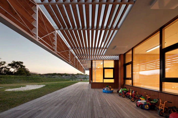 幼兒園設(shè)計(jì)師在設(shè)計(jì)時充分考慮并側(cè)重于資源利用和環(huán)保概念,整個建筑采用中控通風(fēng)系統(tǒng),通過地下隧道引入新鮮空氣,在冬季預(yù)先加熱,夏季則進(jìn)行冷卻。熱水來自水熱泵,并在戶外花園設(shè)置了雨水蓄水箱。