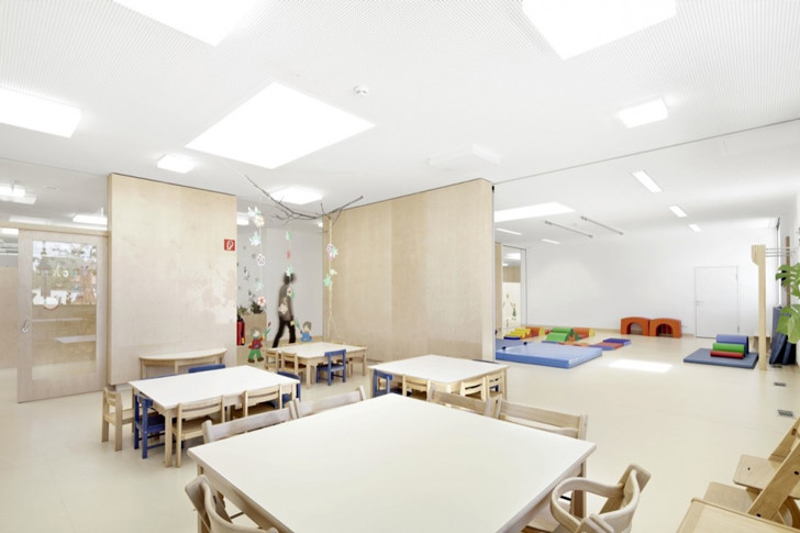 屋頂?shù)脑O(shè)計(jì)和開放活動室形成一個新的介于內(nèi)部與外部之間的空間。通過在南北方向的單位位移,在活動室之間形成了視覺連接效果。這個專門為幼兒園設(shè)計(jì)的活動室完全可以融入教學(xué)工作中。