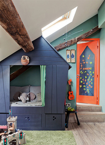 在兒童房里搭建一個小小的木屋,木質(zhì)的地板再碰上綠色如同綠草一般的柔軟地毯,讓孩子在房間里能體會到室外的感覺,而且屋中屋的設(shè)計也會很受孩子的歡迎也會給孩子更多的空間安全感。