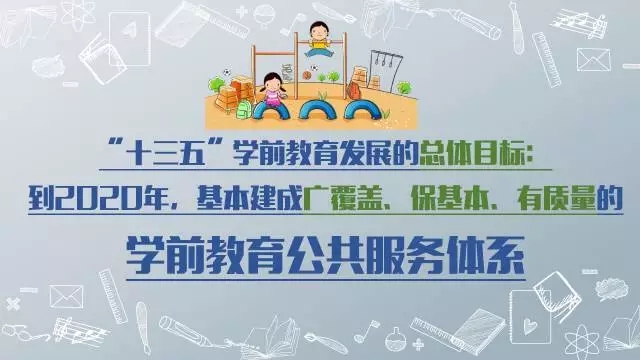 《意見》對“十三五”學(xué)前教育改革發(fā)展做出了全面部署,提出了“十三五”學(xué)前教育發(fā)展的總體目標(biāo):到2020年,基本建成廣覆蓋、?;尽⒂匈|(zhì)量的學(xué)前教育公共服務(wù)體系。