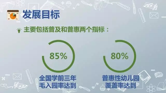 主要包括普及和普惠兩個(gè)指標(biāo):全國學(xué)前三年毛入園率達(dá)到85%、普惠性幼兒園覆蓋率(公辦幼兒園和普惠性民辦幼兒園在園幼兒數(shù)占在園幼兒總數(shù)的比例)達(dá)到80%左右,這是落實(shí)“十三五”規(guī)劃,實(shí)現(xiàn)學(xué)前教育基本普及、解決“入園難”“入園貴”的關(guān)鍵指標(biāo)。
