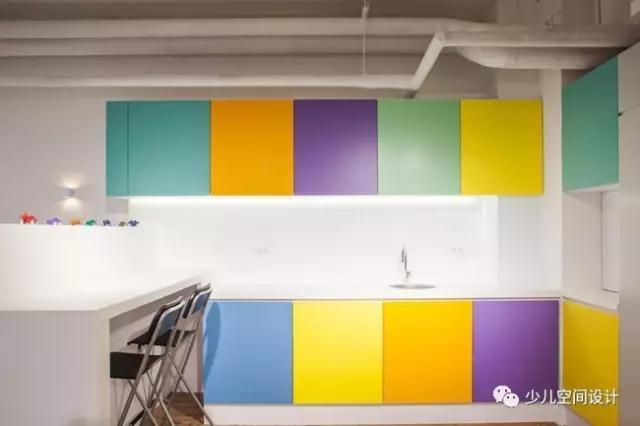 就餐區(qū)和休息區(qū)是專門為家長和老師設(shè)計(jì)的兩個區(qū)域,他們可以在這里交流溝通孩子的情況。就餐區(qū)在功能上是一個帶有多重色彩櫥柜的敞開式廚房,它這樣的設(shè)計(jì)還可以激發(fā)孩子的興趣以及異想天開的想象力。就餐區(qū)的顏色都源自Babysteps的標(biāo)識中相同的色調(diào),與幼兒樂園整體的設(shè)計(jì)在視覺上形成統(tǒng)一,同時它也與整個室內(nèi)空間微妙的單色調(diào)相互協(xié)調(diào)。