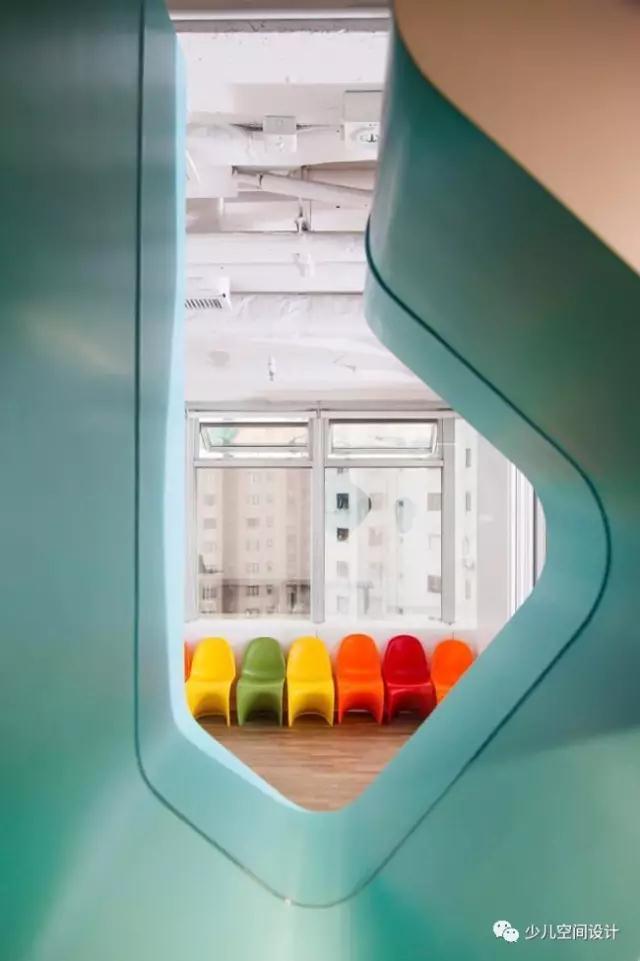 緊鄰的休息室是由鋸齒狀的三層平臺形成的區(qū)域,建在房間的一個角落,靠著窗臺玻璃幕墻的邊緣,并沒有占用孩子們的游戲區(qū)。無論是欣賞孩子學(xué)習(xí)的成果,還是日常點(diǎn)滴的進(jìn)步,休息區(qū)都為家長提供了一個完美的視角去觀察孩子。