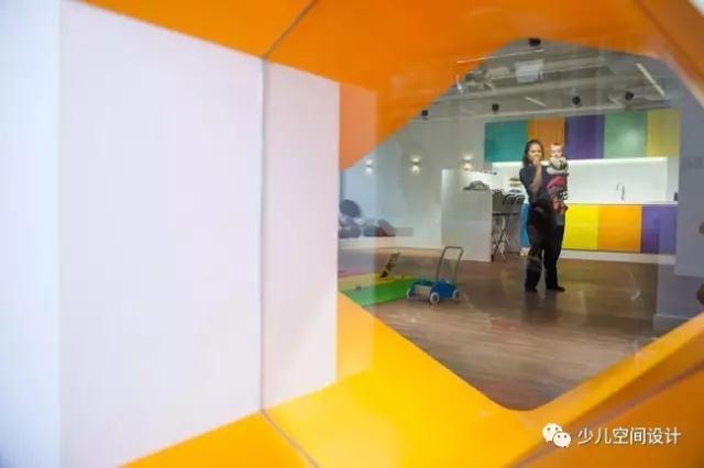 探索和運(yùn)動區(qū)是幼兒樂園的重點(diǎn)區(qū)域。幼兒園室內(nèi)設(shè)計(jì) 在這個開放式的,明亮而怡人的活動區(qū),可以容納多種運(yùn)動方式:純粹運(yùn)動的方式、感知觸覺的方式、還有安靜的方式。一面帶有幾何圖案的彩色墻壁極具特色,這堵墻圍成了一個儲存區(qū)角,并且自然而然地將活動區(qū)內(nèi)不同方式的運(yùn)動區(qū)分割開來。進(jìn)一步來說,這種分割還可以讓孩子和家長通過墻上幾何圖案的窗框看到教室里面的情景。
