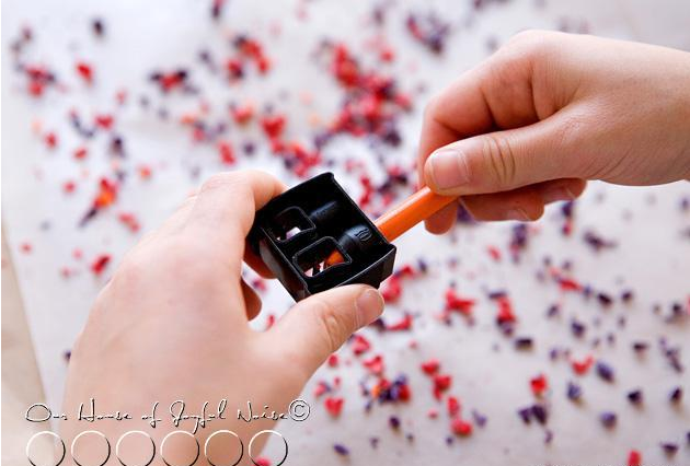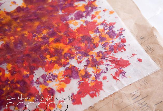 將牛皮紙鋪在蠟紙下面,削蠟筆屑