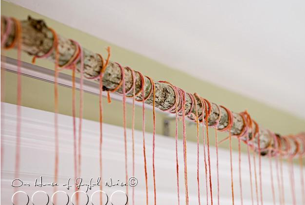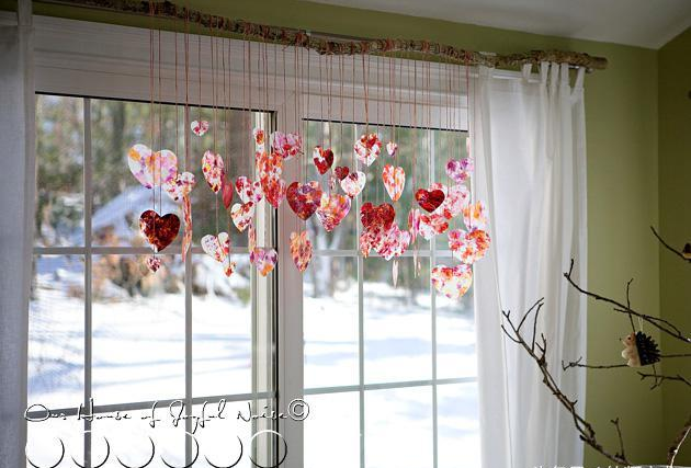 用絲帶將心形圖案串起來(lái),調(diào)整不同的長(zhǎng)度,裝飾教室