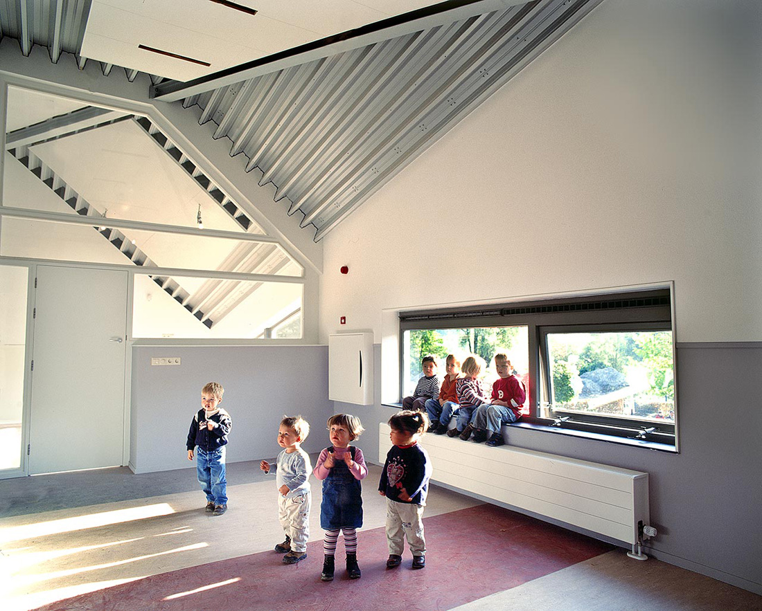第二層是一個(gè)大大陽(yáng)臺(tái)是專(zhuān)門(mén)給孩子們活動(dòng)的,對(duì)于一層而言,陽(yáng)臺(tái)還能成為一個(gè)遮陽(yáng)罩。建筑一端尖形的屋頂與農(nóng)場(chǎng)的環(huán)境相協(xié)調(diào),而另一端是一個(gè)更為現(xiàn)代化的平頂,像是一個(gè)谷倉(cāng)。這樣的組合給整個(gè)建筑結(jié)構(gòu)一些不穩(wěn)定的、親切感。彩色木條紋和玻璃的運(yùn)用強(qiáng)調(diào)了這種感覺(jué),這是一座具有親和力的建筑,看起來(lái)像是兒童筆下的杰作,它一點(diǎn)也不雄偉,但卻充滿(mǎn)了夢(mèng)幻色彩。