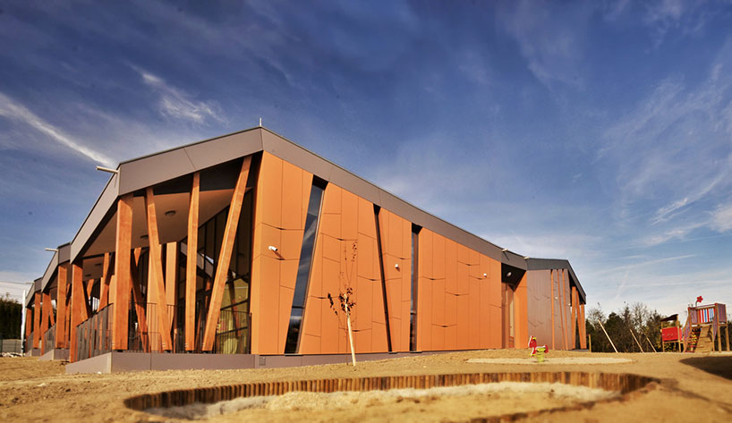 斯洛文尼亞幼兒園Kekec的擴(kuò)建部分。外圍的墻是用彩色玩具木板制成的。天然的木板可以使孩子們在玩耍中辨識不同的顏色,同時感受到木頭的天然質(zhì)感。