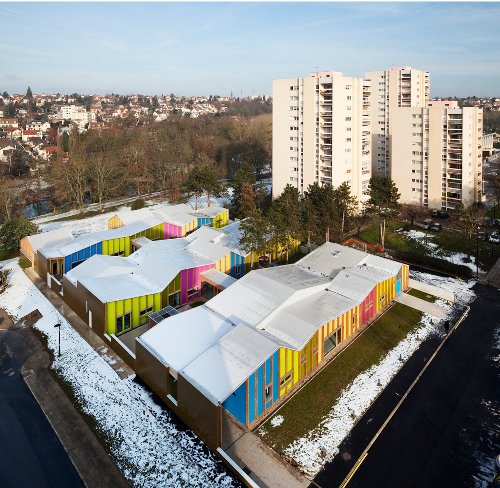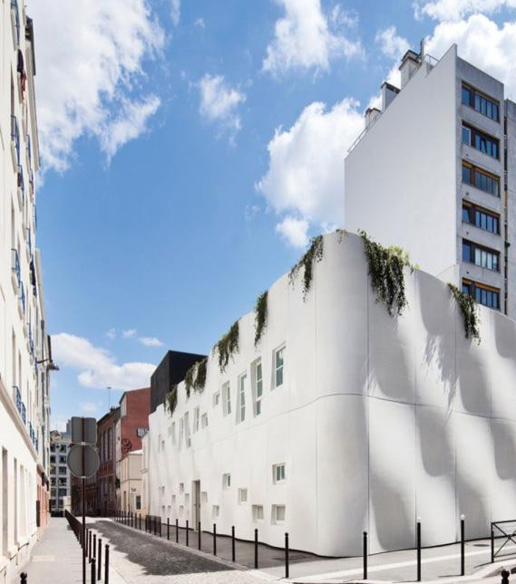 這是由法國事務(wù)所ECDM設(shè)計的一個托兒所項(xiàng)目,它呈現(xiàn)出起伏的混凝土墻壁,這種漣漪的效果是通過采用一系列的預(yù)制板面形成的,它們環(huán)繞建筑的三側(cè),只有一側(cè)包含開口的窗戶。一個院落位于兩層樓的中心,周圍環(huán)繞為孩子們準(zhǔn)備的房間,可以容納66名孩童。一個樹形的金屬傘遮擋結(jié)構(gòu)為院落提供遮陰,從街道看去好似漂浮在屋頂之上。