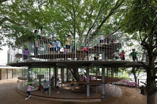 半暴露的結(jié)構(gòu)被中心樹木巨大的枝葉覆蓋。建筑內(nèi)部高5米,這個開放的巨大“樹屋”中有許多壓縮和封閉的空間,只有半蹲、爬行的小朋友才能通過。為了保護(hù)小朋友,建筑師沒有設(shè)計過多欄桿,而是在地面上覆蓋了一層橡膠墊,以減輕意外磕碰。