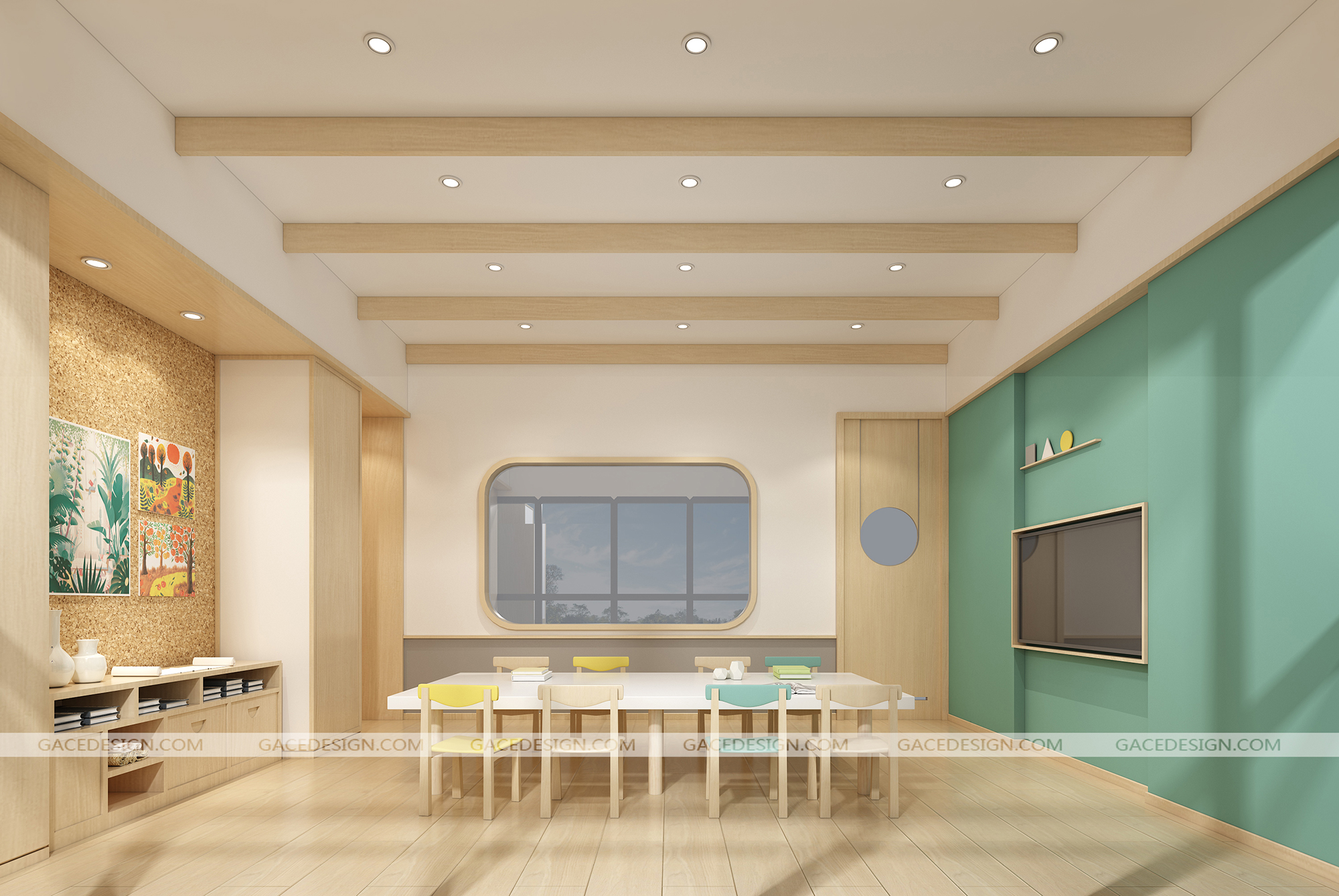 采光:墻盡量少,多用玻璃窗。窗戶(hù)盡可能大,窗臺(tái)盡可能矮。墻裙盡量低,多在50cm以下。外墻可以直接采取落地玻璃,擴(kuò)大采光和兒童視野。門(mén)要通透。但至少有一塊大面積墻,做主題展示用;同時(shí)也增強(qiáng)幼兒的安全感。